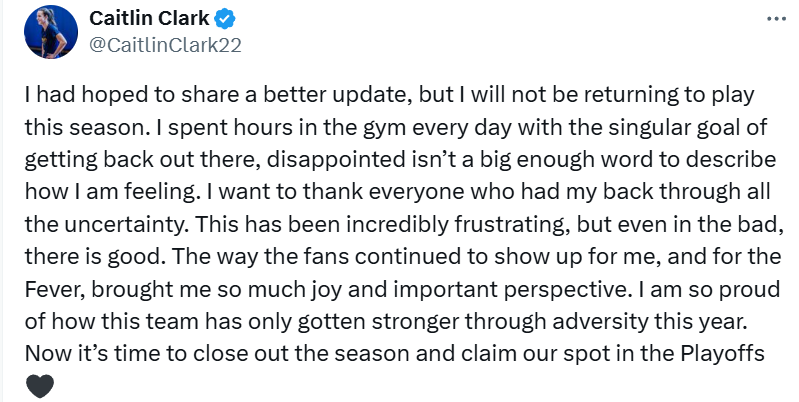 “在此期间,凯特琳付出了极大的努力,为康复和重返赛场做了一切可能的尝试,但最终,时间并不站在我们这边,”狂热队首席运营官兼总经理安珀-考克斯在球队发布的新闻稿中表示,“尽管我们会继续与凯特琳保持协作,并为她提供所有可用资源,但本赛季剩余时间已不足以让她安全回归,而她的长期健康与福祉始终是我们的首要考量。我们期待她能以完全健康的状态迎接2026赛季的开启。”